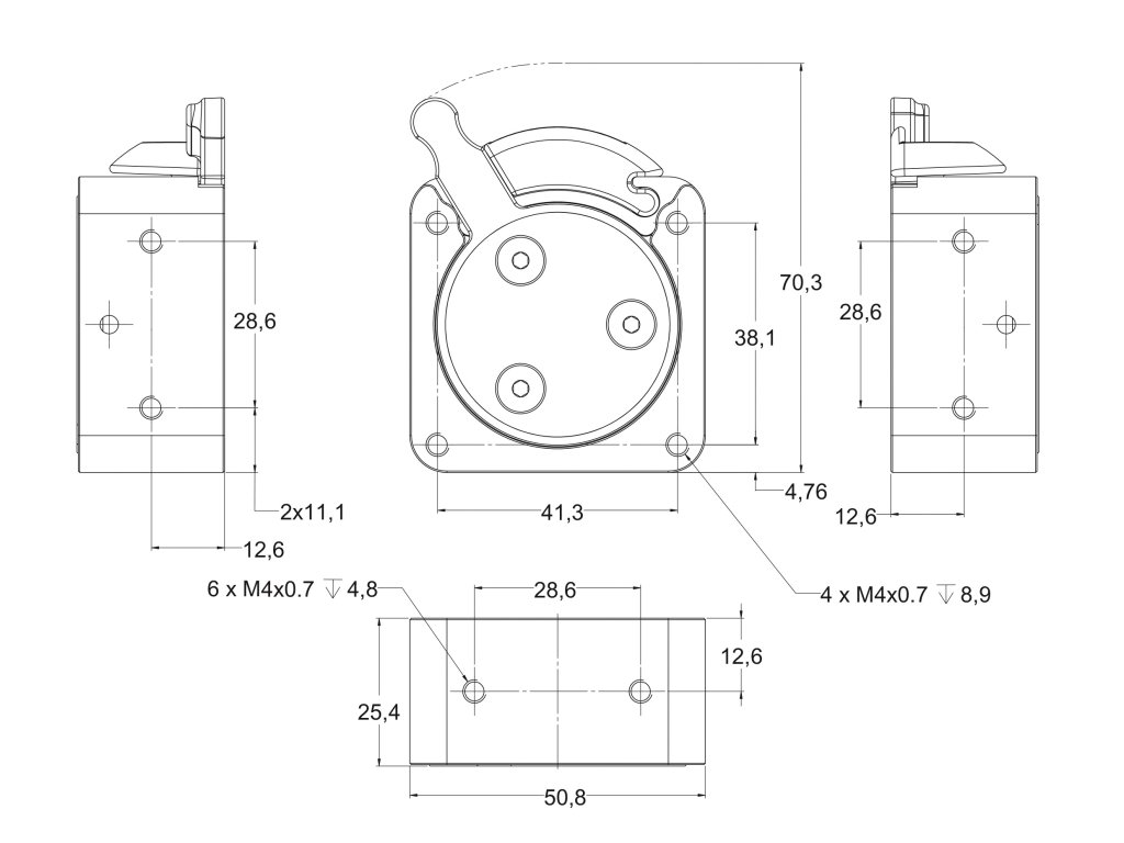 Des filetages de raccordement sur le dessus et sur trois côtés de l'aimant permettent de personnaliser presque à l'infini le TMC 70, qui ne pèse que 29 grammes, avec vos propres pièces d'assemblage.